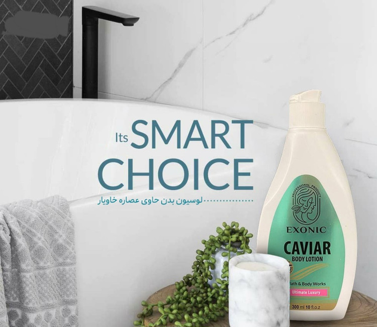 بسیاری از ما خشکی پوست خصوصا پس از استحمام را تجربه کرده ایم، لوسیون بدن خاویار Exonic با دارا بودن ویتامین A,B,D,E,C و آنتی اکسیدان های فراوان و امگا ۳ باعث لطافت و نرمی پوست شده و با تحریک کلاژن سازی و افزایش خاصیت الاستیسیته پوست روند پیری و ایجاد چروکهای پوستی را به تعویق می اندازد.