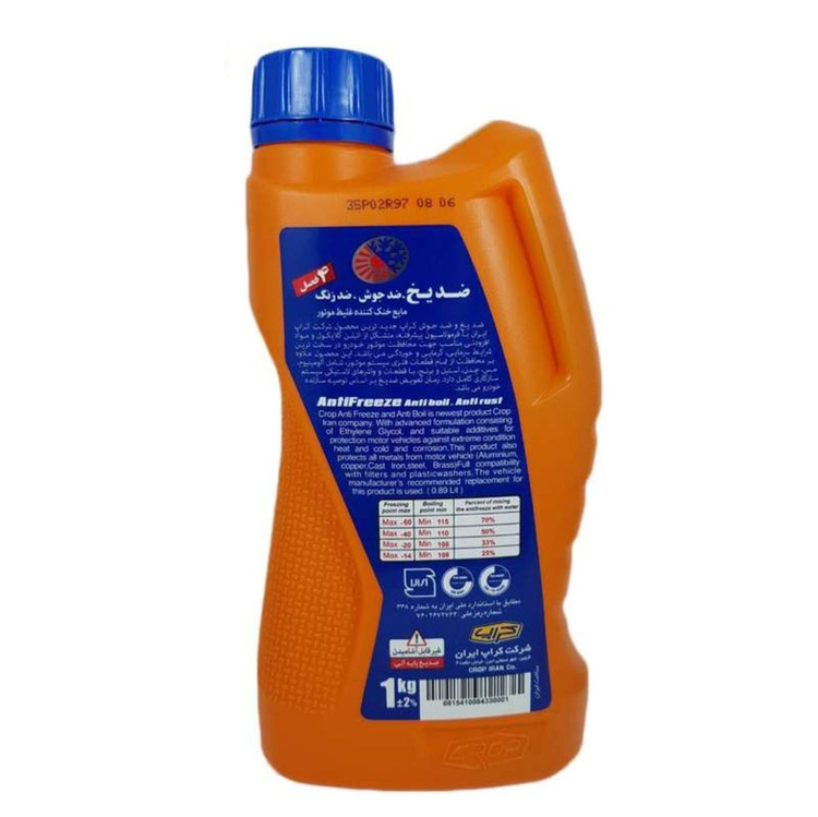 ضدیخ و ضد جوش کراپ جدیدترین محصول شرکت کراپ ایران با فرمولاسیون پیشرفته متشکل از آتیلن گلایکول و مواد افزودنی مناسب جهت محافظت موتور خودرو در سخت ترین شرایط سرمایی-گرمایی و خوردگی می باشد .